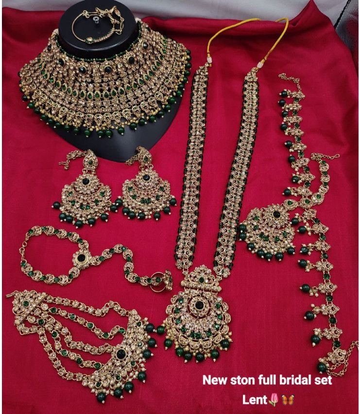 Studded with shimmering stones and finished with delicate pearl drops, this jewellery set reflects classic Indian craftsmanship with a royal touch. Ideal for brides and bridesmaids, it pairs effortlessly with lehengas, sarees, and heavy ethnic outfits for weddings, receptions, and grand festive occasions.