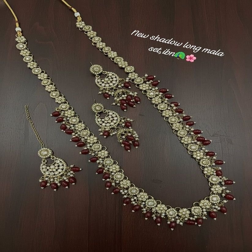 Add timeless elegance to your look with this Shadow Long Mala Jewellery Set, crafted in a premium antique finish. The long mala is beautifully adorned with intricate floral motifs and rich maroon teardrop beads, giving it a royal and traditional appeal. Paired with matching earrings and a coordinating tikka, this set is perfect for weddings, bridal wear, festive occasions, and ethnic functions.