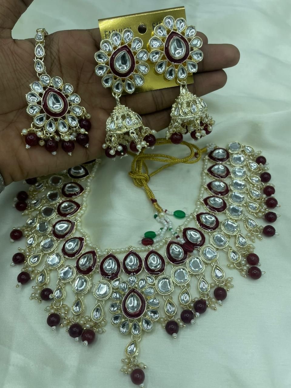 Adornments: Embellished with delicate Faux Pearl stringing and rich Maroon Bead/Stone Drops that hang beautifully from the necklace and earrings.
