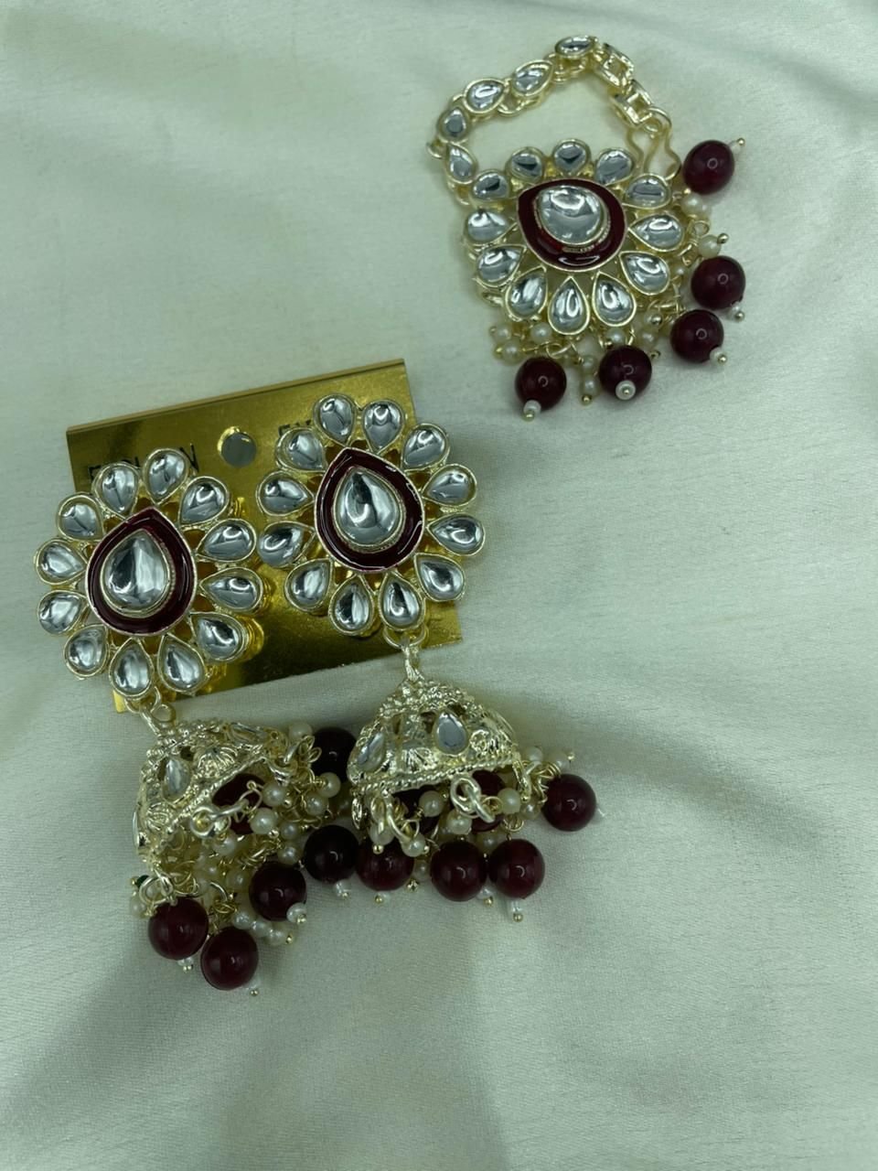 Earrings: Floral-top stud with traditional Jhumka drops, finished with maroon beads and secured with a push-back closure.