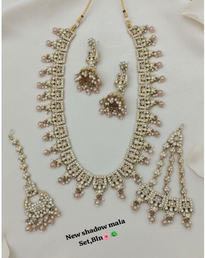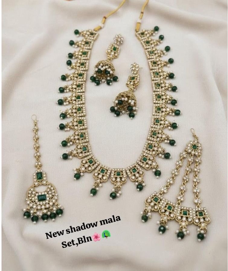 This New Shadow Mala Bridal Jewelry Set is a beautifully crafted imitation jewelry design featuring a long mala necklace adorned with sparkling kundan-style stones and elegant green bead drops. The set includes matching earrings and maang tikka, making it a complete bridal look.