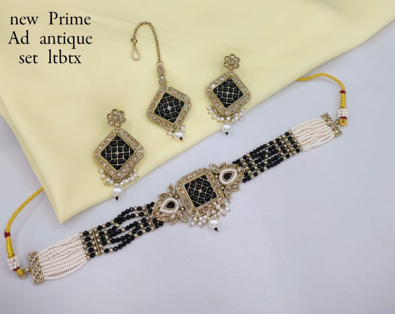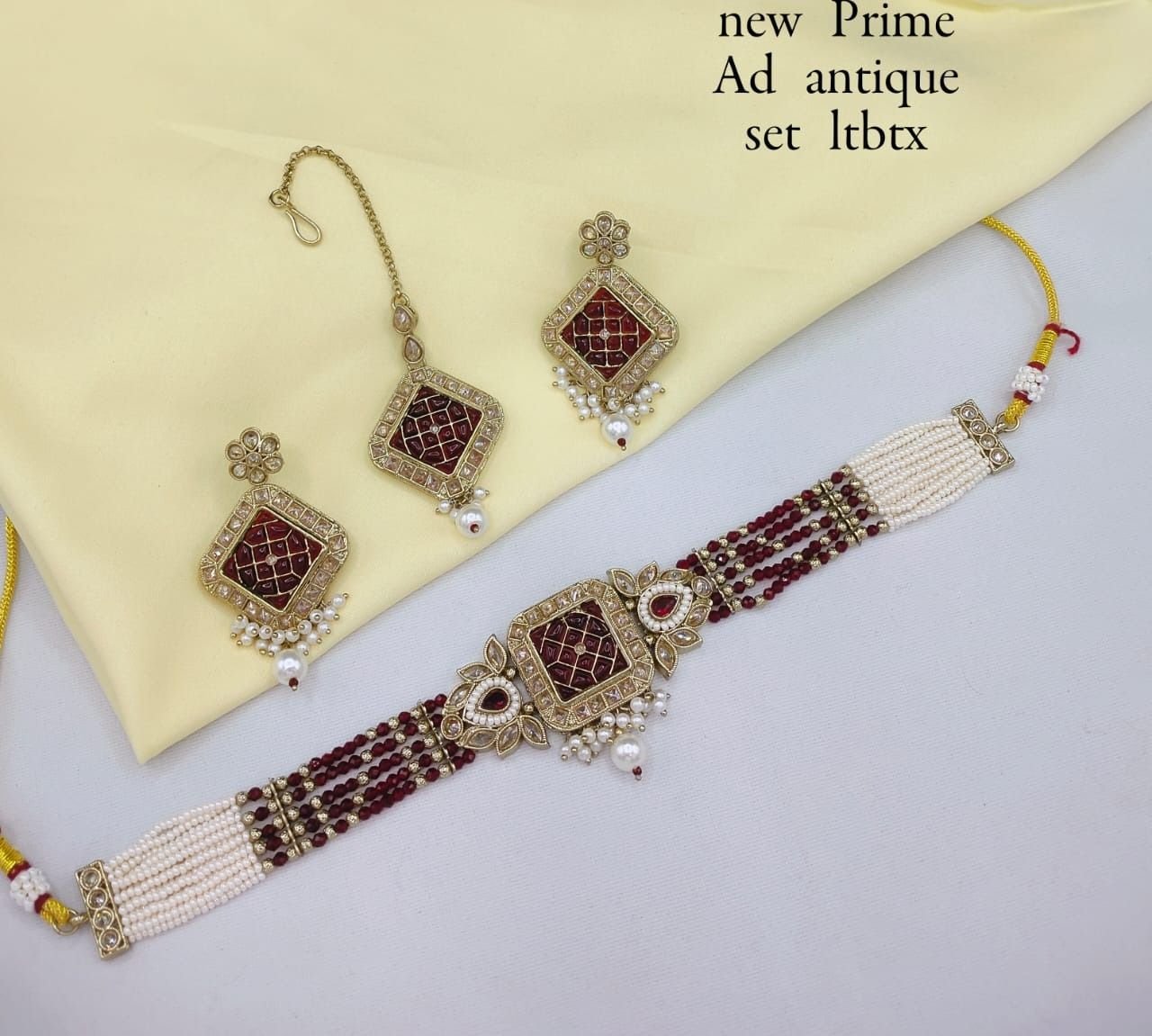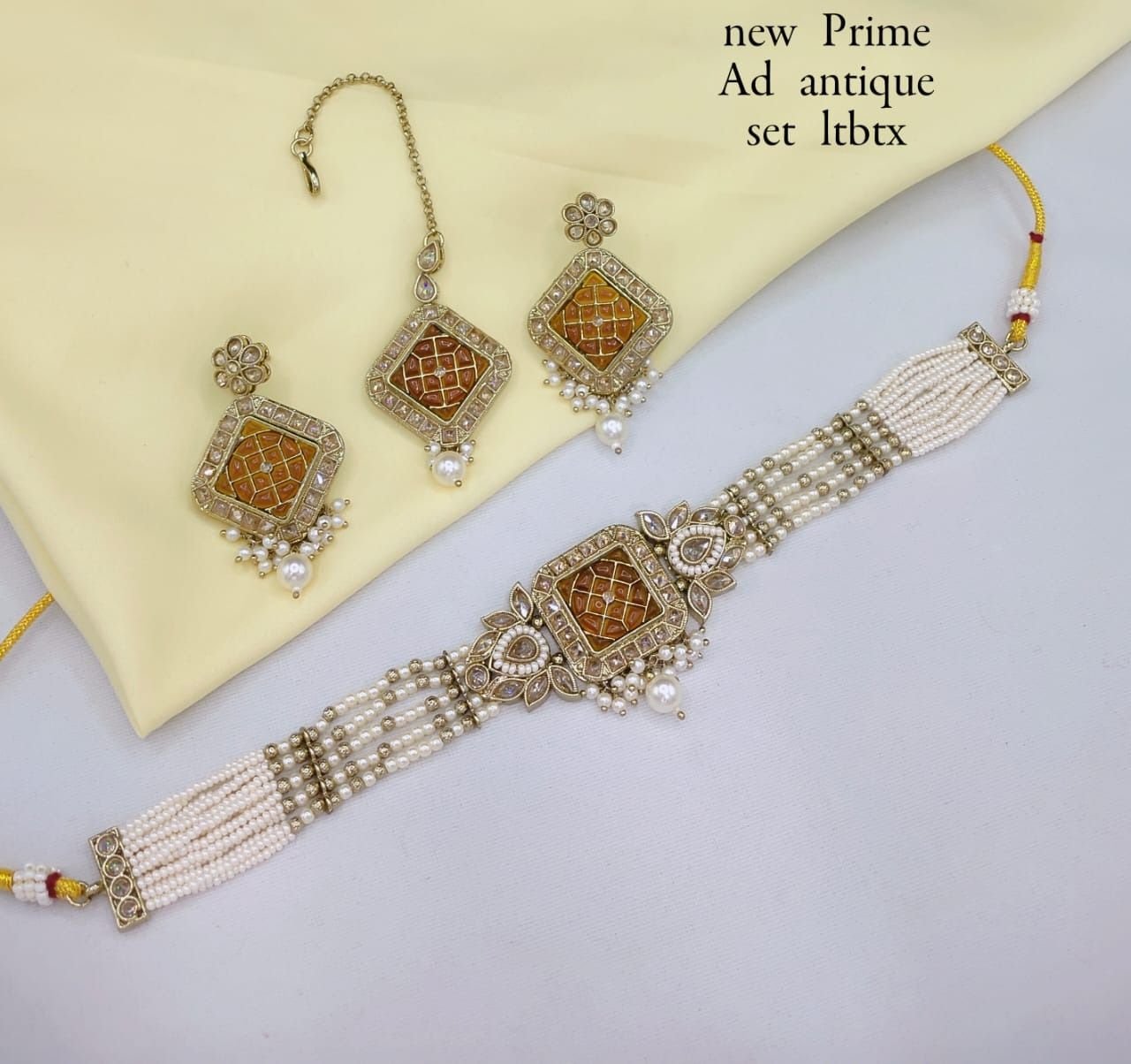 Elevate your ethnic look with this elegant New Prime AD Antique Jewellery Set, crafted with premium-quality alloy and finished in a rich antique gold polish. The set features beautifully designed square motifs adorned with sparkling American Diamonds and delicate pearl hangings, paired with matching earrings and a coordinating maang tikka. The multi-strand beaded necklace adds a royal touch, making it perfect for weddings, bridal wear, festive occasions, and traditional functions. Lightweight, skin-friendly, and comfortable for long wear, this timeless jewellery set enhances both classic and contemporary outfits.