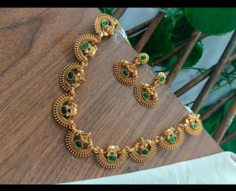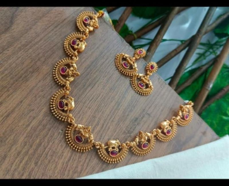 Introducing the Temple Bridal Choker Necklace Set by Yellow Chimes, a stunning piece crafted for women seeking timeless beauty. The set includes a gold plated choker necklace, a long necklace, and matching earrings, all handmade with an artisan touch from the southern part of India.